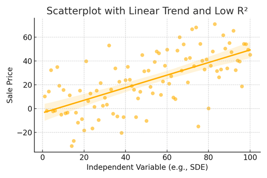 A low R² is often misinterpreted as invalidating a regression model. However, a low R² does not negate a valid linear relationship; it indicates limited explanatory power. Transaction data’s qualitative noise (e.g., buyer motivations) often yields low R², but the regression’s best-fit line remains statistically valid, though less predictive.